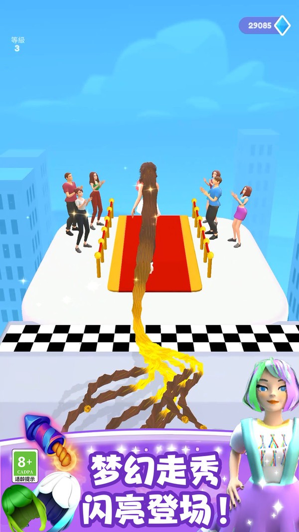 1、头发收集:玩家需要在赛道上收集头发,头发收集得越多,头发长度就越长,最终得分也会越高。