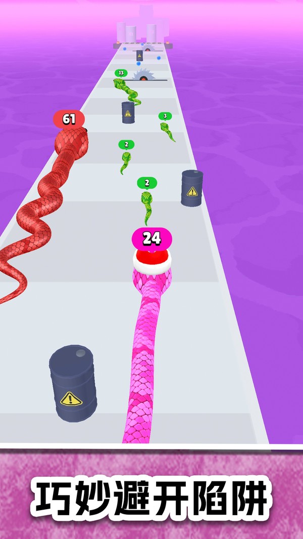 2、策略合并:巧妙利用赛道上的特殊道具,合并同类蛇,快速壮大实力。