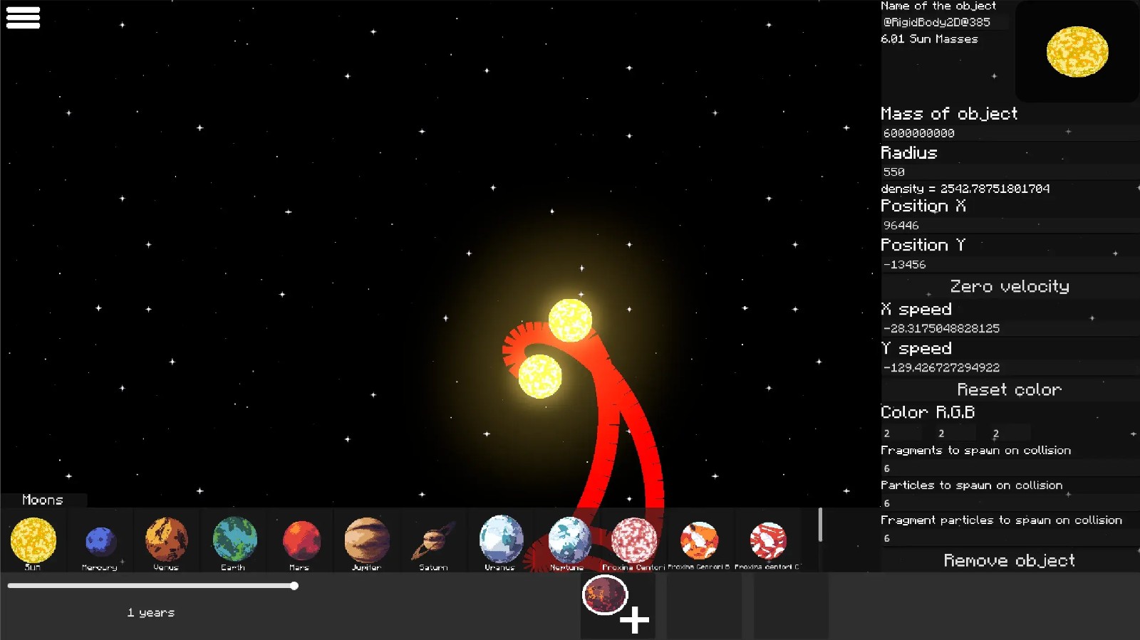 1、自由添加行星,恒星和卫星,调整它们的大小,质量,轨道等参数。