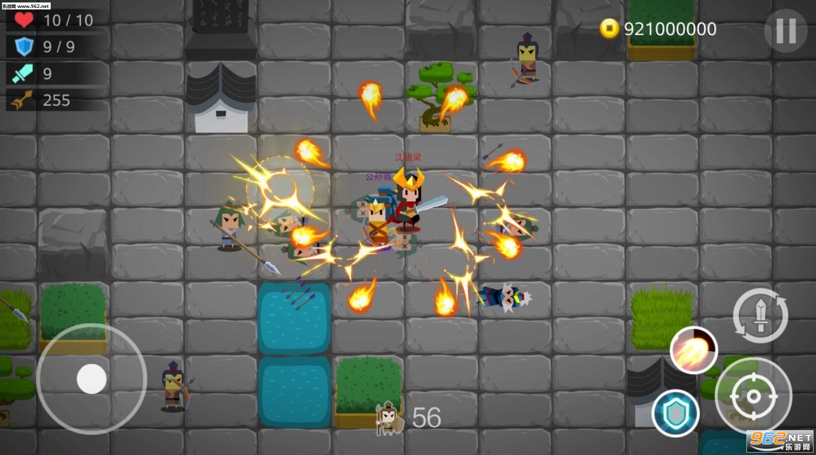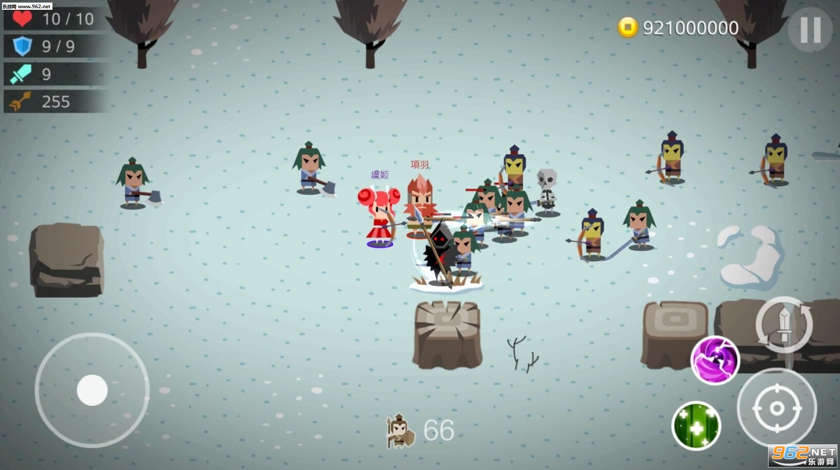 1、游戏里玩家需要解锁自己的武将,然后合理的搭配自己的主将和副将,操控他们进行战斗,打败各种敌人包括弓箭手,长矛兵,斧兵等;