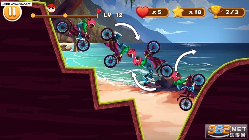 非常不错的一款摩托车特技游戏,游戏区别于普通的竞速游戏来说,除了游戏体验更加爽快之外,酷炫夺目的特技效果也是非常好的视觉上的享受。