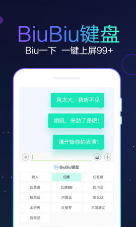 很多时候,很多话想说,但手速严重制约了表达力。说时迟那时快,全新的聊天输入体验,表达简单直接,语言风格随心,这就是讯飞输入法新推出的BiuBiu键盘,堪称刷屏利器。花样怼人、飙内心戏、疯狂追星、神评论、负能量、讨红包……几乎覆盖生活中所有场景,只要开启BiuBiu键盘,不用打字,一键上屏99+!