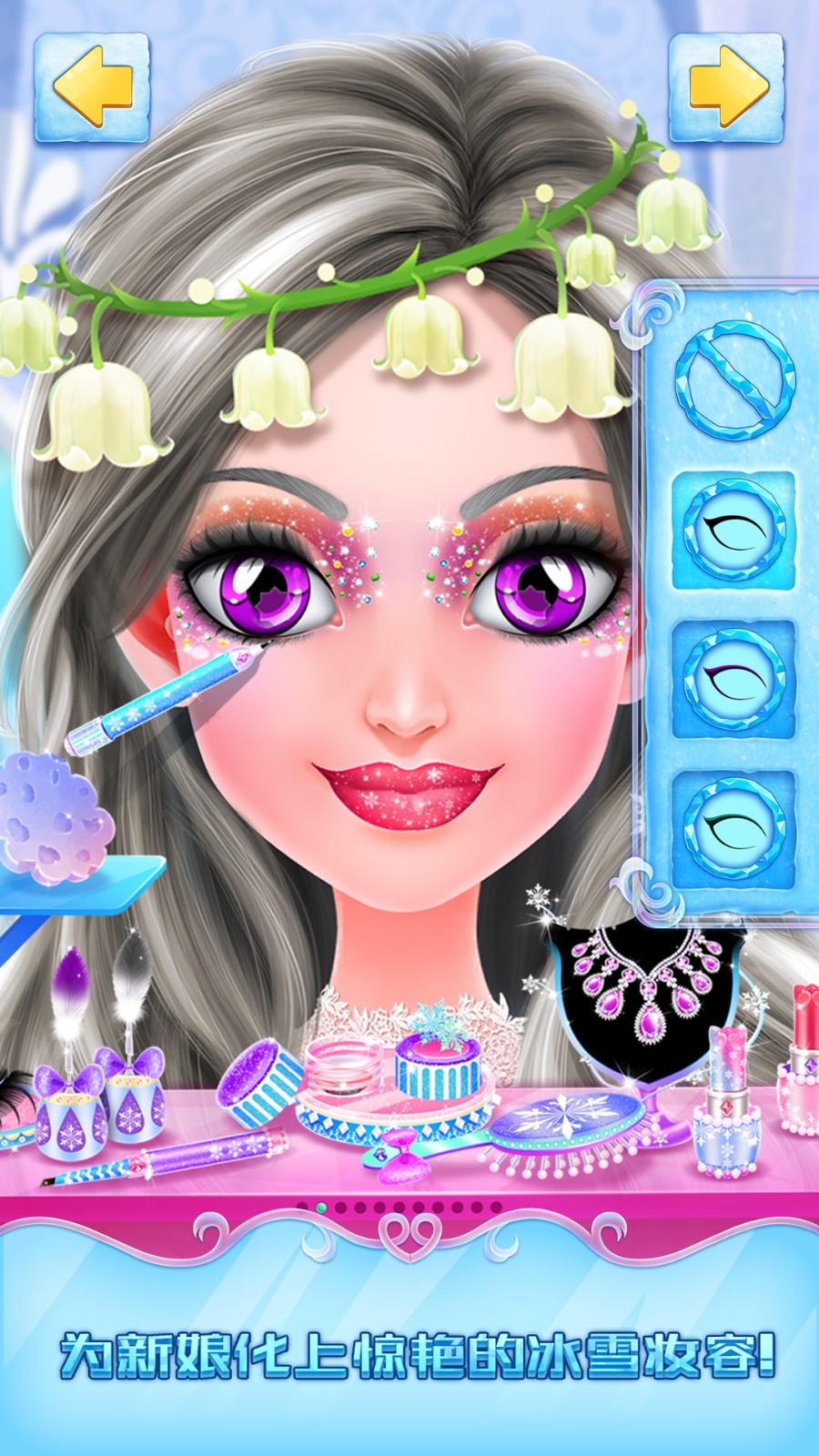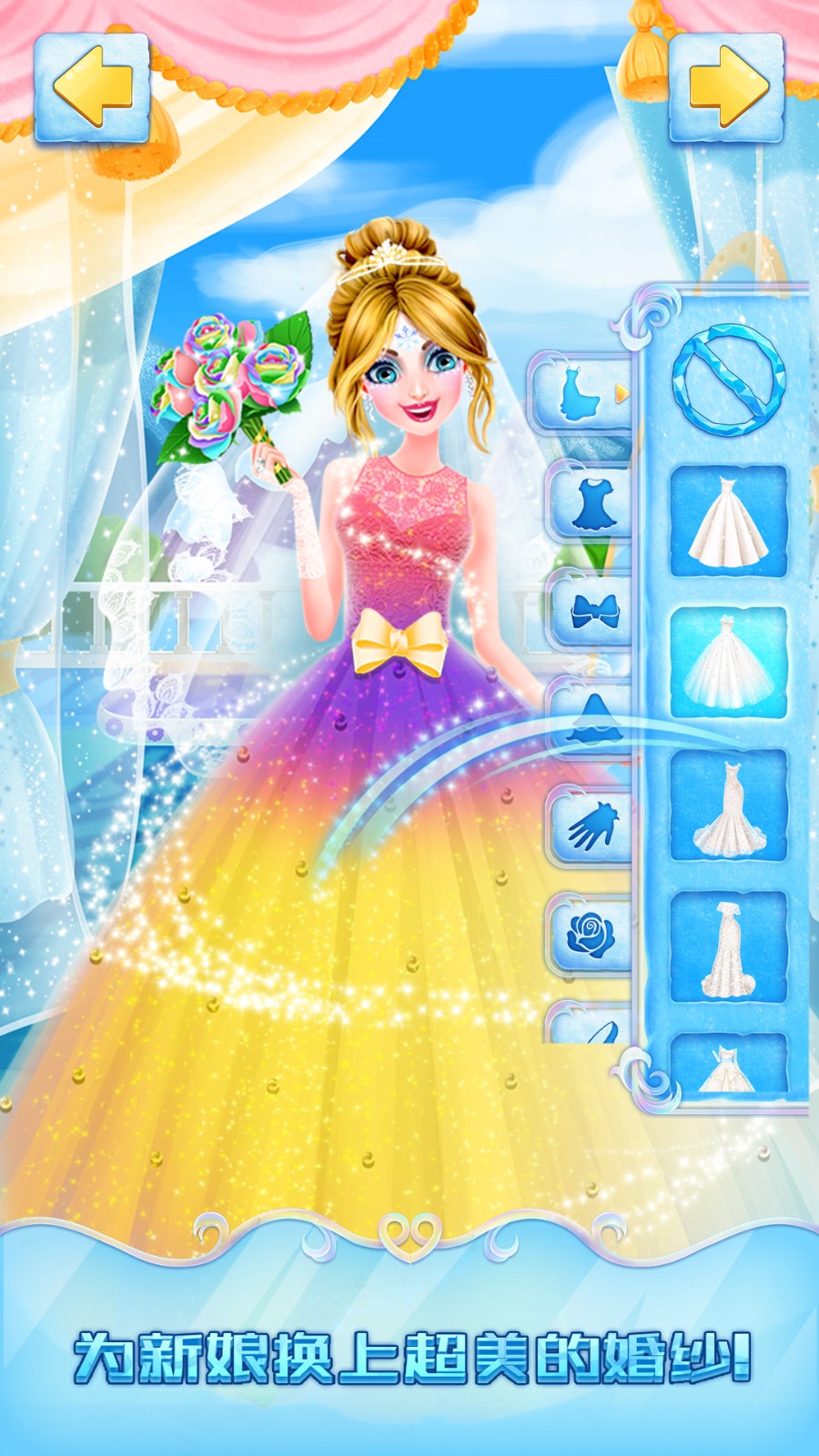 3、冰雪王国的梦幻衣橱早就为公主准备好了各种款式的婚纱,快来挑选一款最特别的换上吧,让公主打扮得无比惊艳。