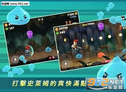 2. 生存模式: 挑戰無限地圖, 巨大Boss緊追在後, 擊倒史萊姆來提升等級及增加速度, 挑戰最遠脫逃距離!