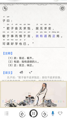 《论语-图文有声国学软件》是由爱好国学的团队所制作,其内容以弘扬中国传统文化、表达儒家思想、体现古人智慧魅力为主,老师深情的朗诵、准确的拼音、完整的注释、甜美的译文、易懂的启示、有趣的故事、水墨风插画、还有实用/易用的学习功能...使其声情并茂从而提升用户的阅读兴趣。