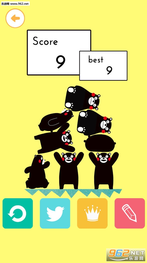 进击的熊本熊手游是一款以日本网红熊本熊为主角的休闲趣味玩法手游,游戏中玩家们需要将下落的熊本熊们尽量保持在平台上,人气应用软件“动物塔”的姐妹应用程序。