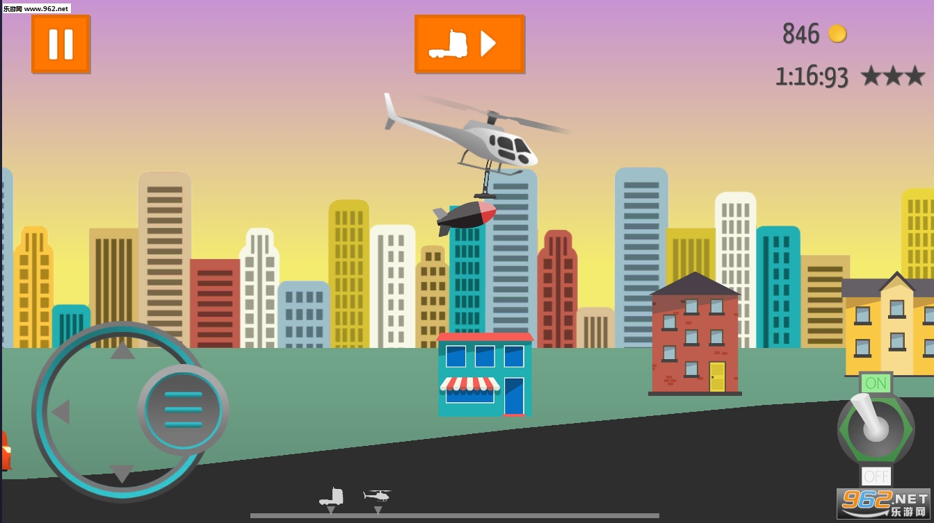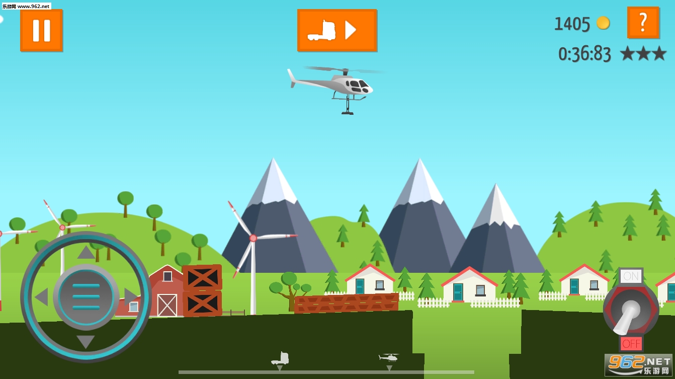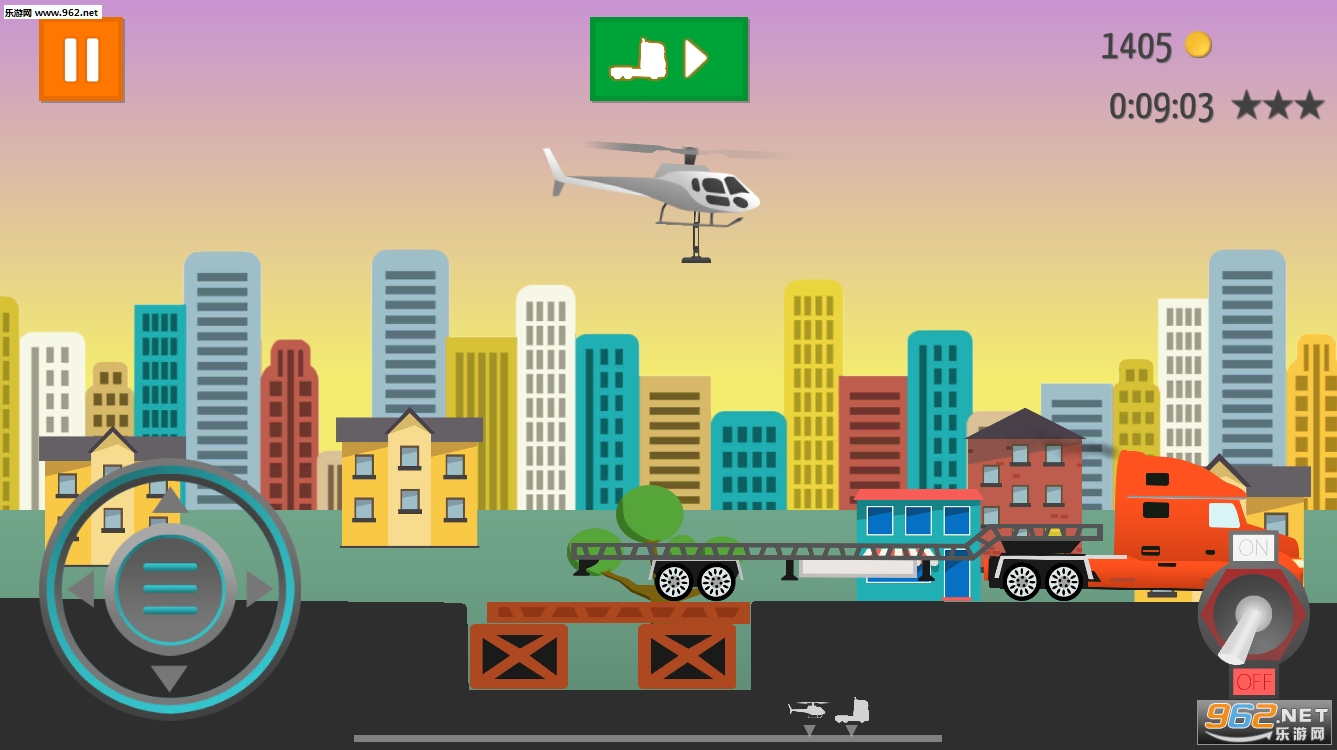 《直升机GO》是款有着许多花样关卡的休闲手游。玩家需要操控直升机的前后左右和底部吸力,将游戏提供的建材按各种要求搭建起来,让卡车通过到终点。该