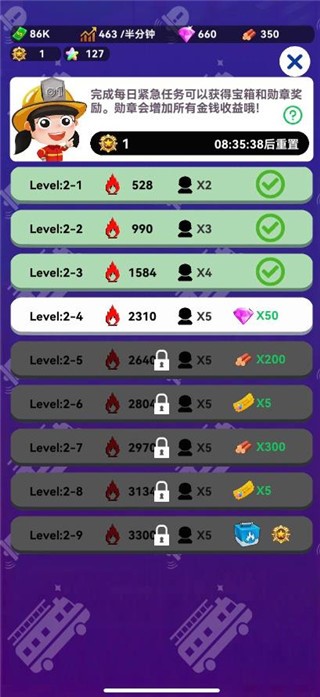 1、不同等级的消防车能够提高更有效的灭火效果,你可以解锁并升级更好的车辆;