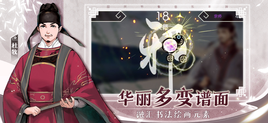 玩家可通过手指描绘书法字完成演奏,这里拥有上百种各种难度的华丽谱面,满足不同玩家需求,而且还加入了古诗歌词互动,跟随音乐律动完美呈现;