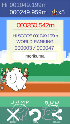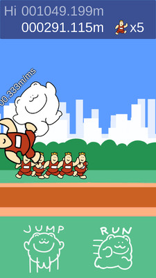 游戏晚饭非常简单,点击屏幕上的虚拟按钮,操控白熊跳跃或者奔跑,躲避人类运动员的使坏,到达游戏终点。