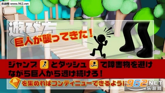 火柴人这次不再是以无敌的姿态出现在世人面前,而是以一个逃亡者的身份被一个泰坦巨人追击着,你要帮助它逃脱巨人的追击。游戏采用虚拟按键控制,左边的虚拟按键是跳跃,右边的则是加速走路的按键,你要不断的点击右边按键让火柴人快速前进,不然你就会被巨人抓住的!