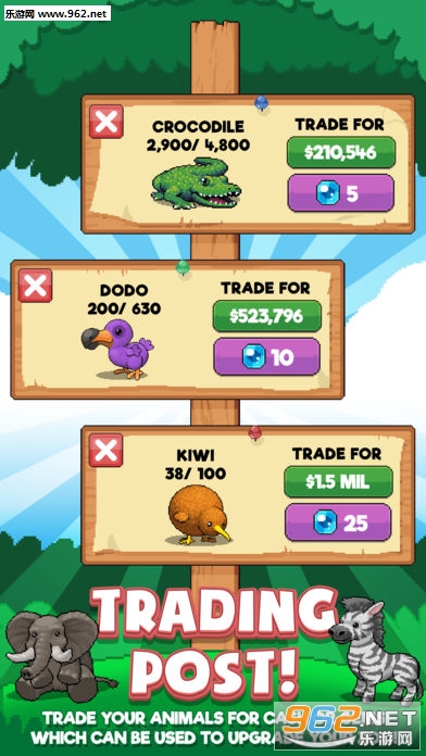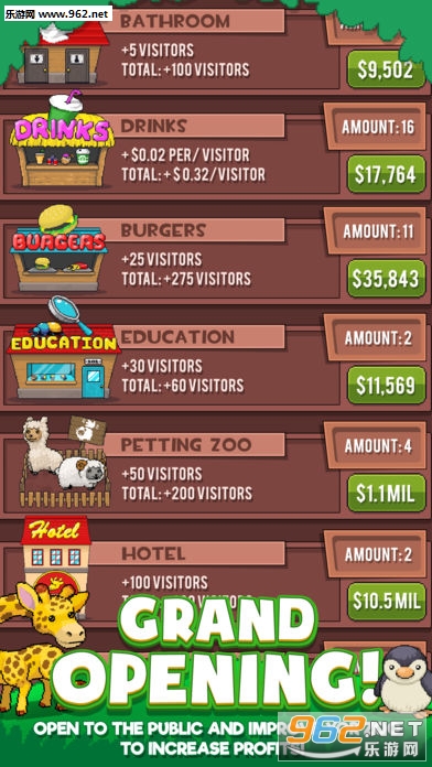 饲养动物、建设娱乐设施或者装饰动物园,吸引更多的游客,赚取更多的金币。支持离线挂机,轻松好玩不烧脑!