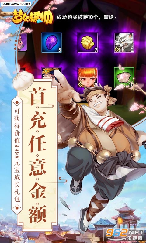 首充任意金额可获得价值9998元宝成长礼包,含四星吕青橙镖师,99技能书,1200元宝,战力提升快人一步;