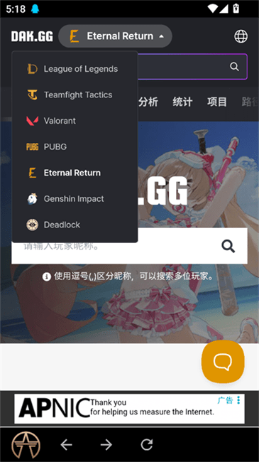永恒轮回黑色幸存者dak.gg(ER)能够在手机上进行战绩查询,包含的数据非常详细,支持查看排行榜以及统计,有专业的角色分析,支持同时搜索多位玩家,及时接收最新的游戏资讯,还能查看最新路径。