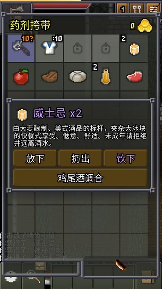 威士忌的像素地牢最新版是一款可以体验到独特的像素地牢冒险类的游戏,新增了不少的职业,战斗起来也都是很激情的,为你保留了地牢玩法的魅力和乐趣,也增添了不少爽快的调酒玩法和内容,在地牢里面获取很多的资源和玩法,展开属于自己的精彩战斗和乐趣。