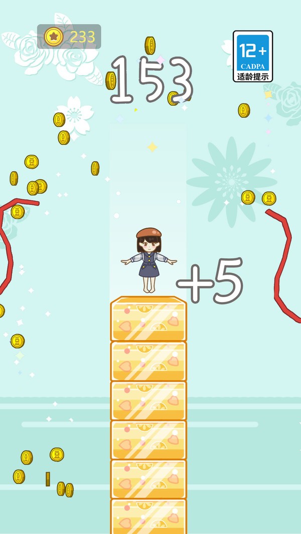 3、把豆腐一块一块的堆叠在你的脚下,灵活的向上跳跃,躲避各种突如其来的障碍物;