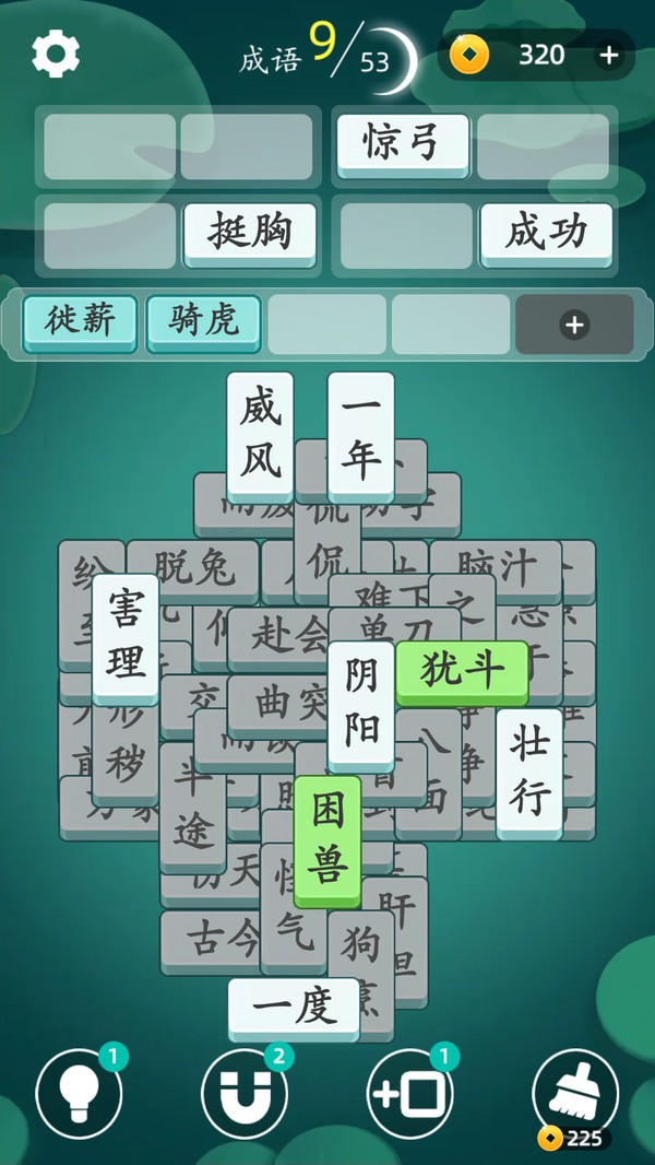 3、随机挑战:一些汉字随机出现,然后依次选择可以形成习语的汉字,并测量一组单词的能力。