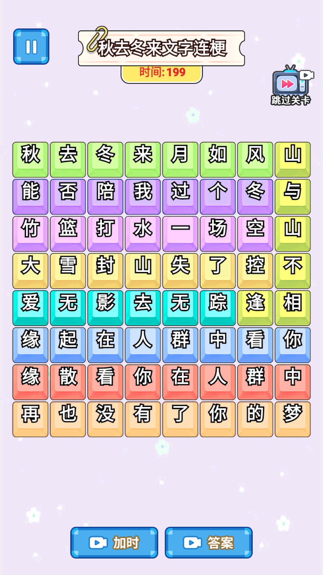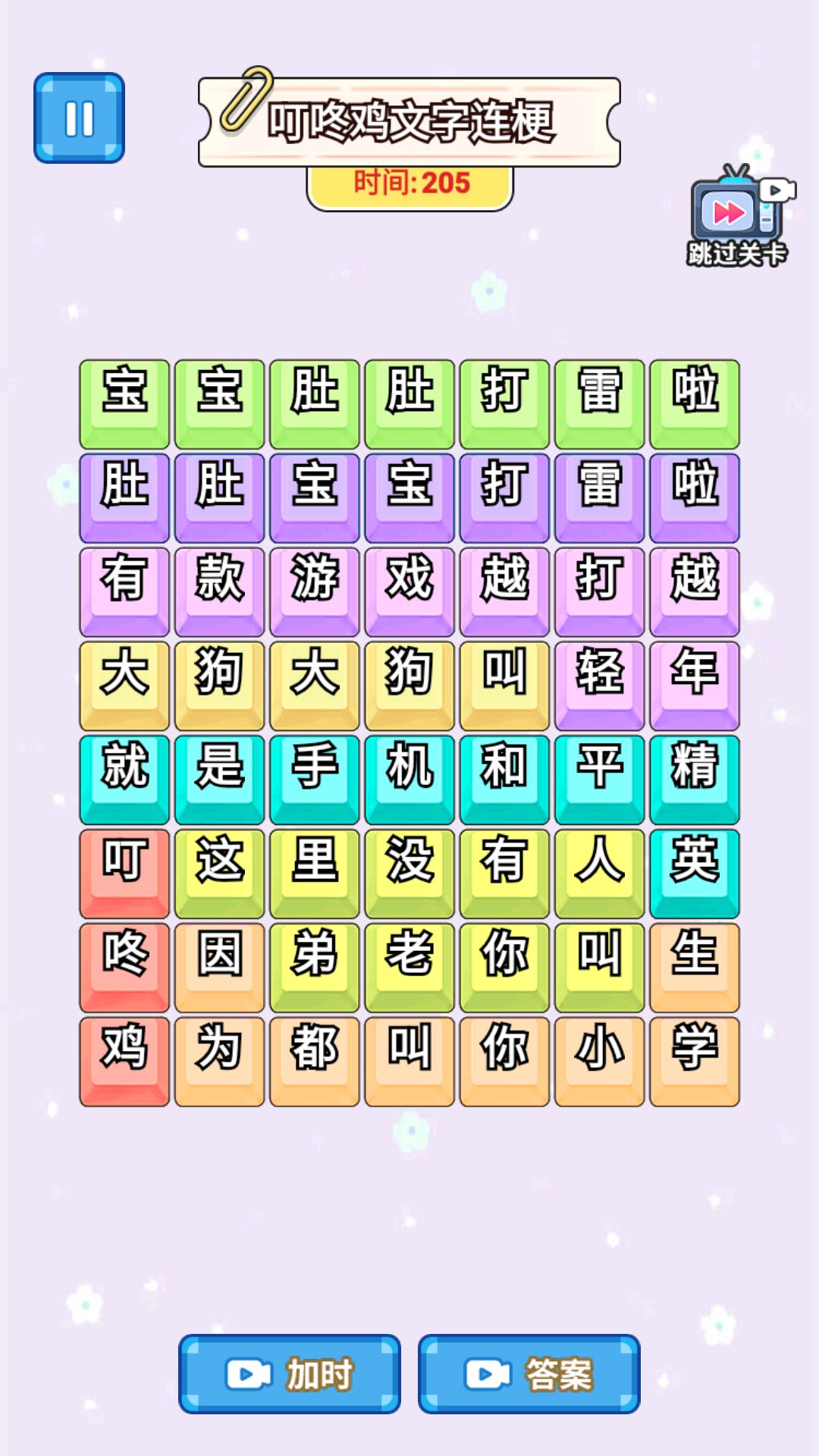 3、可以根据实际情况选择跳过关卡、使用加时道具或查看答案等操作完成挑战。