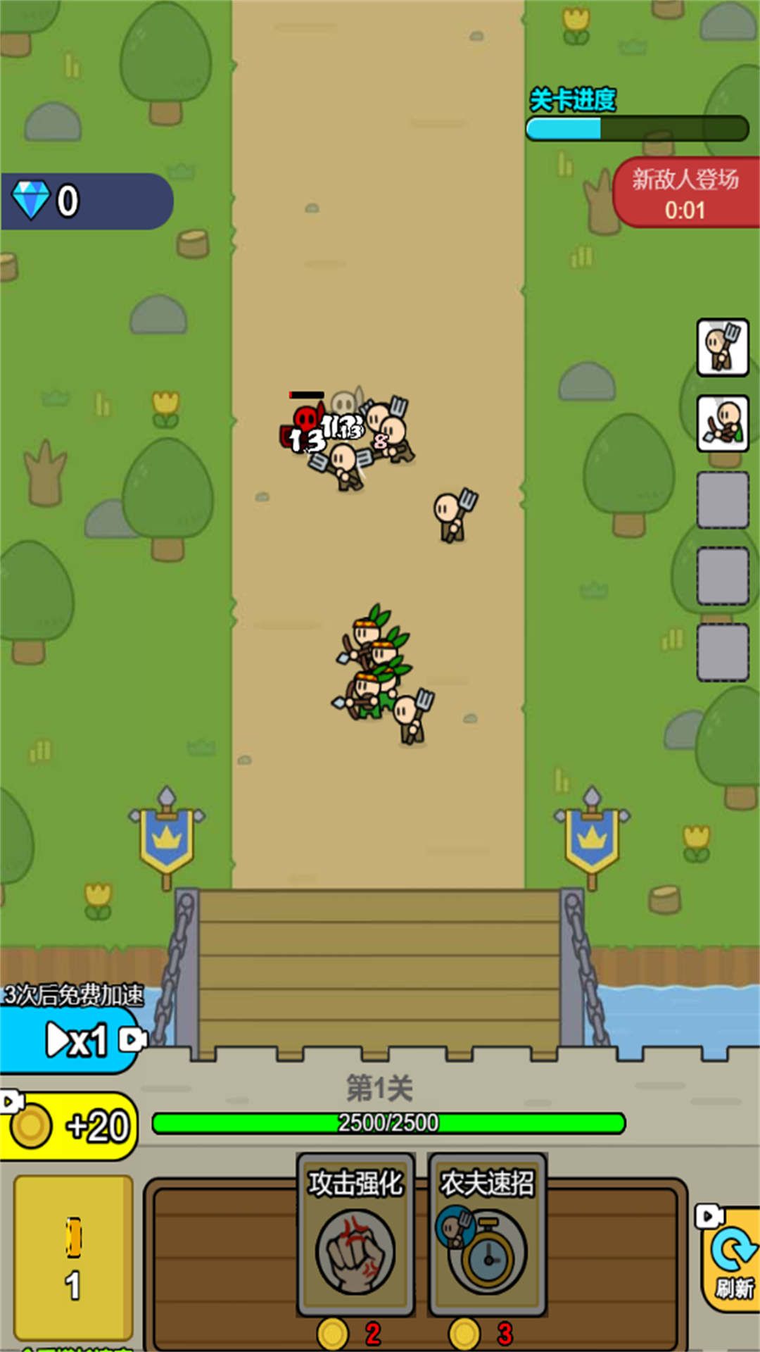 2、利用资源刷新防御设施,购买攻击强化、农夫速招、弓手成长等增益效果。