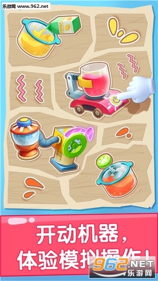 在加热容器里融化糖块,用混合器将果汁汽水融合、在灌装机上将果汁装好。神奇好玩的机器世界,等你大显身手!