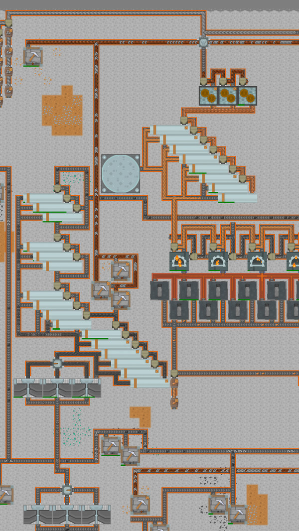 6、一般开局容易卡的就是锡矿,你可以尝试多次开局,直到刷出首层有锡矿在开始玩,这样就简单些,因为如果首层没有锡矿,那就要挖到-5层才有锡矿(后面标识方便前面就不加号了),刚开始有限解锁科技,每出现一种东西,如果不确定怎么布局,可以先保存个存档,最好重新命名,免得覆盖,尝试下怎么放才能合计利用空间。铁矿是最重要的资源,所以根据矿场资源布局,最后分区域建厂,铁矿加工占的地方最大,因为要高炉炼钢,初期不要建太多,够解锁科技就行,出了钢块后,就要建挖矿机了,首层建一个就够了,建议放到4个角落里面,不占用布局,只要输入混凝土和水,就可以一直往下钻