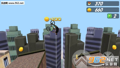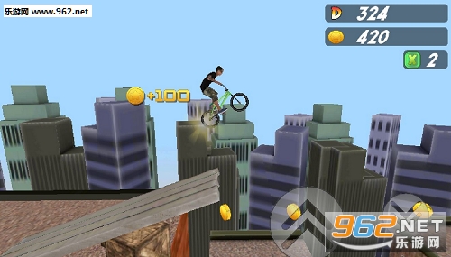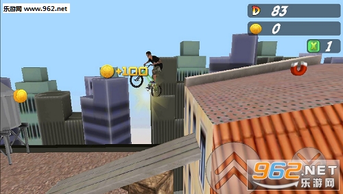 控制角色在屋顶上骑单车,收集金币,跳跃避开障碍,要注意起跳的距离和时间。