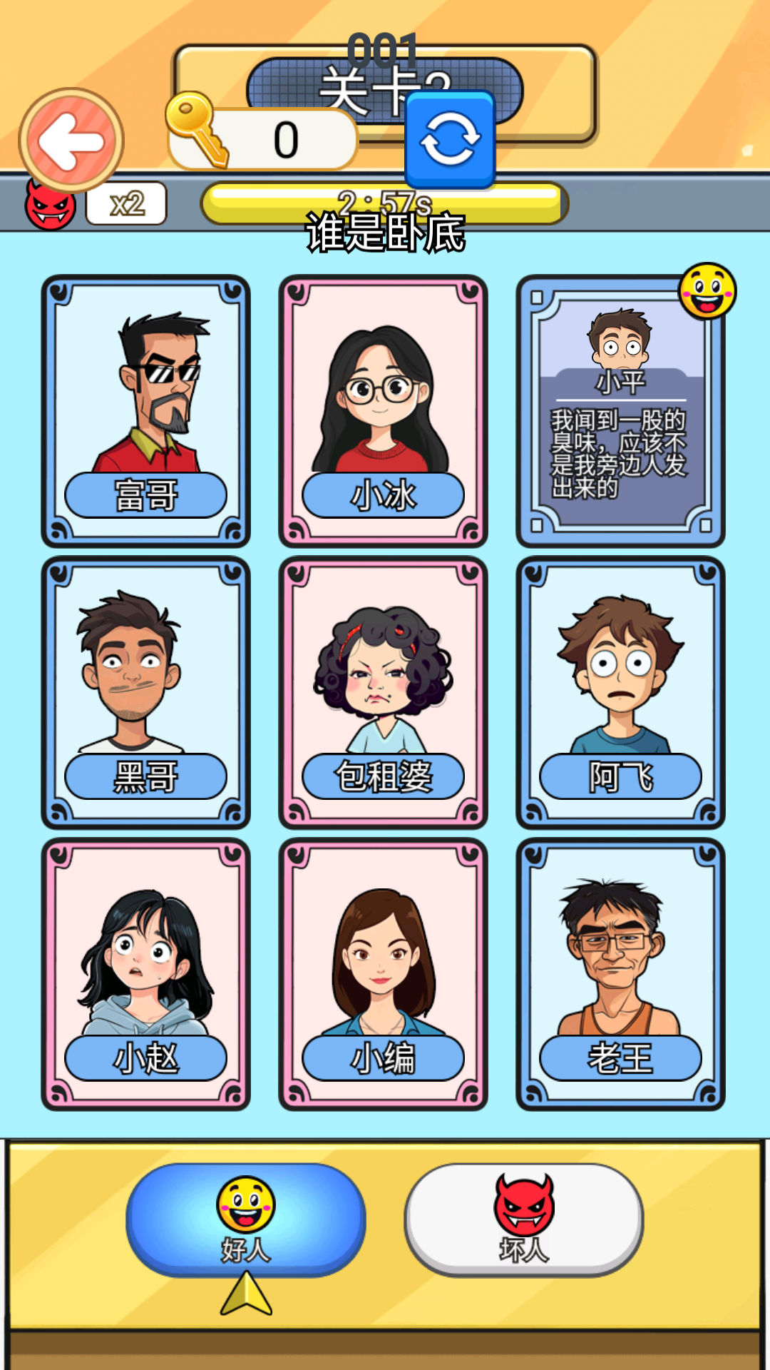 谁才是大卧底一款非常好玩的解谜闯关游戏,游戏里面玩家需要通过对话和提示来完成推理挑战,找到真正的卧底,非常考验玩家的思维逻辑能力,还有丰富的关卡挑战等你体验,让你可以在这里玩得过瘾,每个关卡都有不同的场景和剧情,给玩家带来沉浸式的游戏体验。