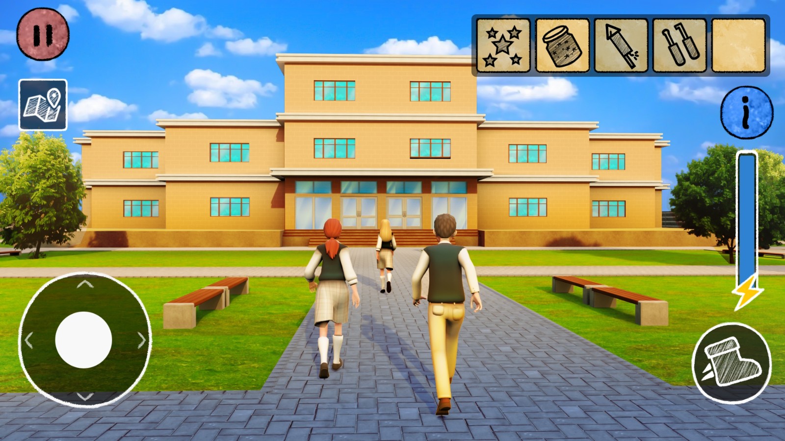 2、非常精彩的高中校园生活即刻开启,可以扮演男生或者女生,通过虚拟杆操控角色;