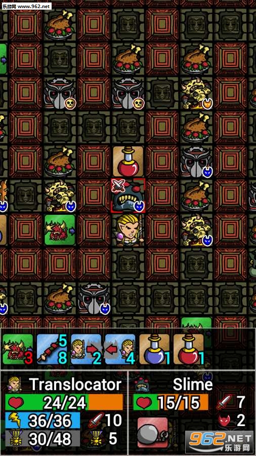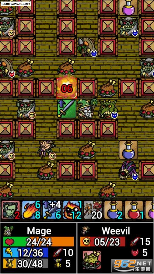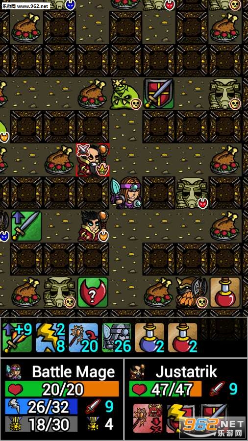 游戏风格有点像魔塔,玩家在迷宫里遇到怪物对战,可以通过获得装备或回血道具来帮助自己战胜强大的怪物,并且游戏中每个角色还有自己的技能帮助角色更有效的杀伤敌人。