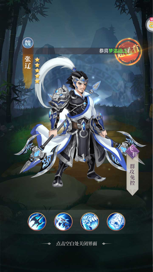 一技能【魔神降世】攻击前中排,强力输出重创敌人。三技能【方天画戟】继续输出,连斩3次对方前排。