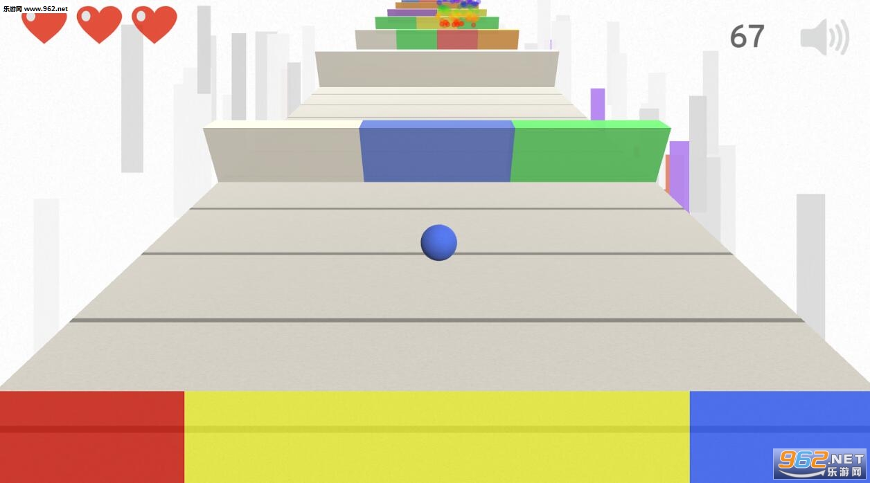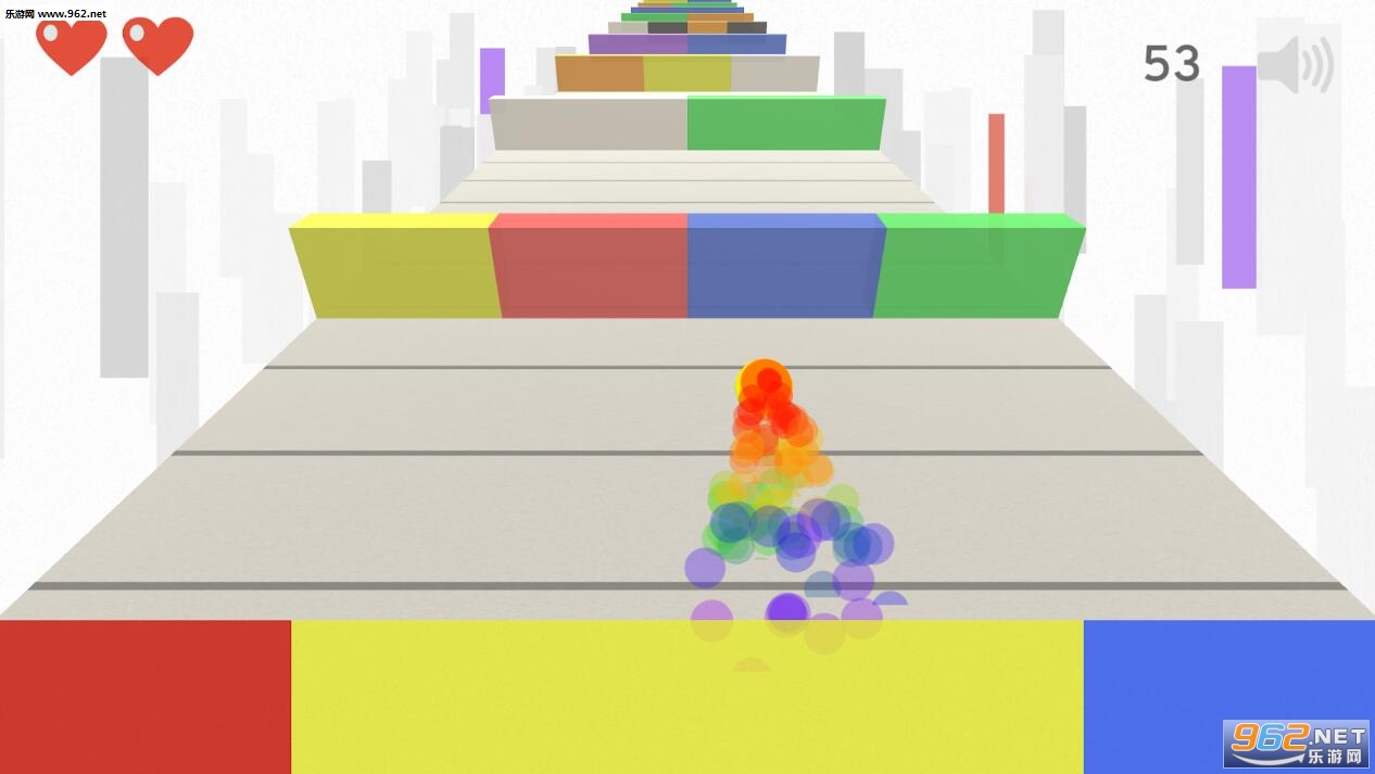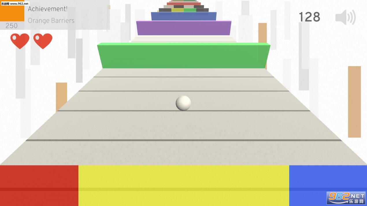 按住一个按钮会变成你的球被保持在该按键的颜色来,拿着两个按钮向下将这些原色组合成一个次要的颜色。红色和黄色让橙色,黄色和蓝色,使绿色,红色和蓝色使紫色。松开按钮,使你的球白。你会受到伤害,如果你打一个黑色的障碍或敌人,除非你有彩虹电。收集心脏电源UPS,以获得额外的生命和经济放缓电源UPS,以减缓你的球的前进速度。