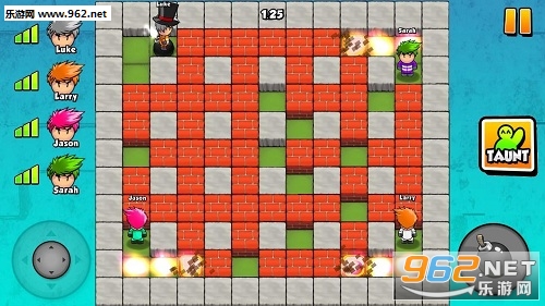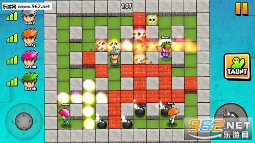 游戏玩法跟炸弹超人、爆爆王一样,很容易让人玩到停不下来喔!游戏控制的部分不难,左手边会有控制方向的按钮,只需利用手指转动方向即可前进,右边则是放下炸弹的按钮,要小心别炸到自己!而在游戏进行的1分半钟内你必须避开自己以及敌人的炸弹活下来,炸开墙之后会出现道具,有增强火力、可以多放几颗炸弹等,如果不小心被炸死了还会变成小鬼,只要去碰活着的人还会让他们出现特殊效果。快来看看谁能存活到最后吧!