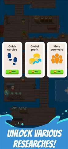 2、随着资源的积累,你可以逐步升级木筏设施,建造新的平台和建筑,将小小的木筏发展成一座庞大的浮动城市。每个新建筑都为你的社区提供独特的功能,如居住区、食物生产设施和科技研究所。
