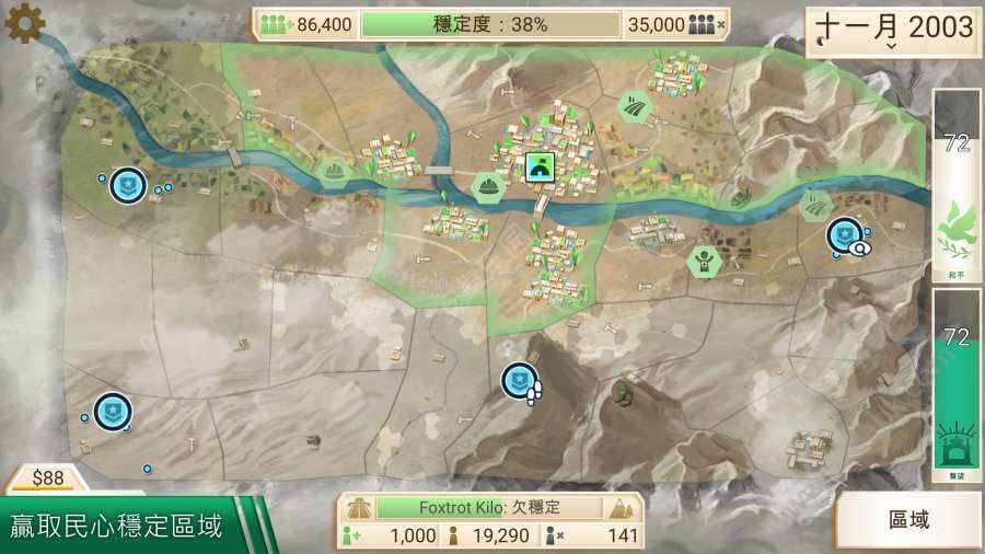 可以在叛军出现之前就可以进行军事活动,开局随机在一个区域送一个要塞,额外增加国军的战斗力,还有一次保命的技能,声望低于八点时,可以提高到八点。将军在民生投入方面会比别的管理者贵一点点。注意在反腐和民生的投入。