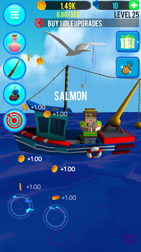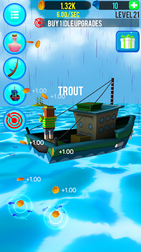 游戏玩法非常简单,点击屏幕就可以钓鱼,钓到鱼就有金币可以收,省劲装备后钓到的鱼的种类和数量都会上升。