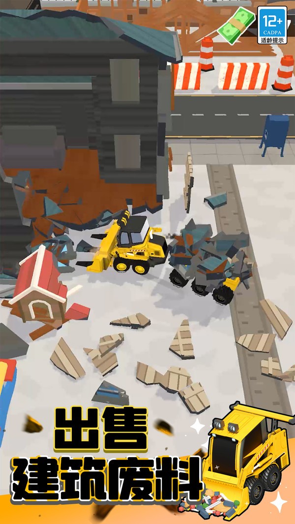 4、融合了建造玩法,超级解压的模拟游戏,游戏中你可以控制巨大的推土机摧毁建筑,通过出售废料赚钱,然后建造属于你的城市