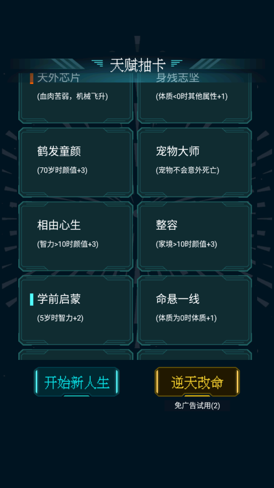 趣味的模拟人生的游戏,玩家可以选择各种不同的天赋去冒险,可以自由加点,体验不一样的人生,比如经商、修仙等等,游戏已修改,属性点随便加天赋随便选,喜欢的朋友可以下载试试。