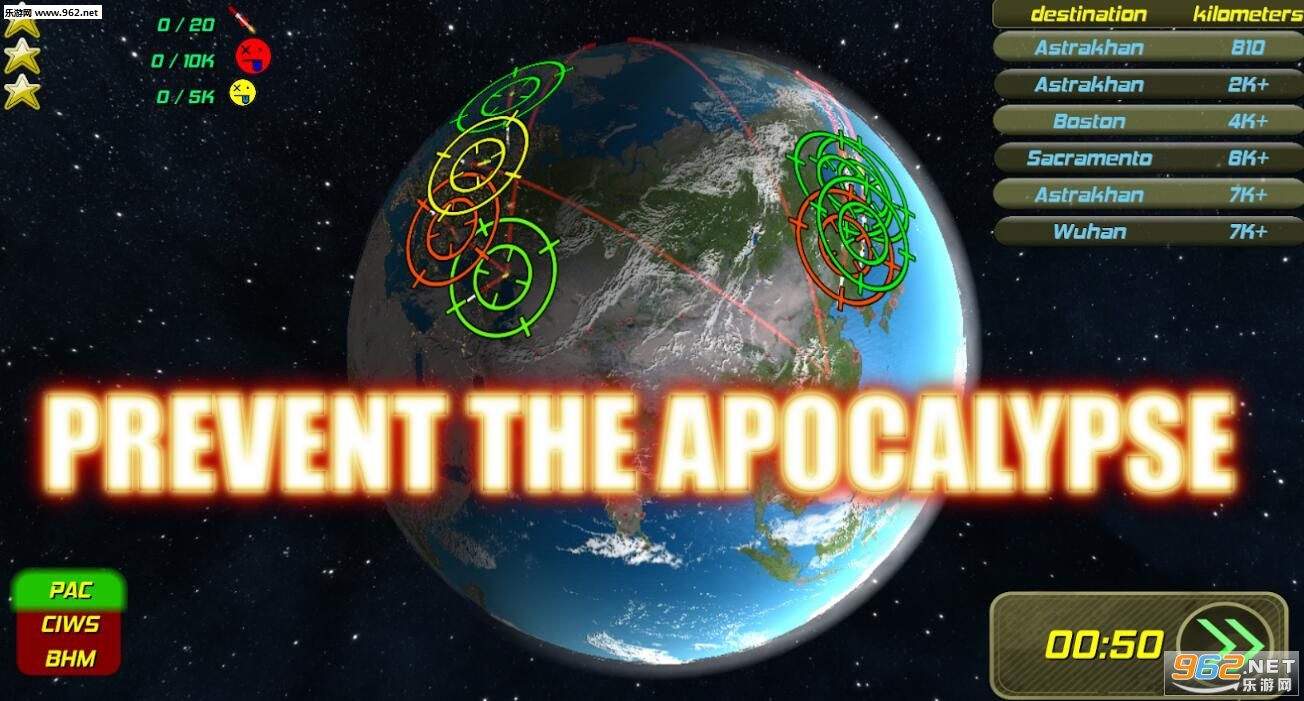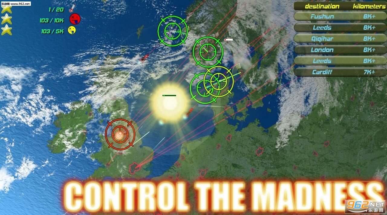 一款比较有教育意义的策略游戏,被众多核弹围绕的地球时刻都会陷入危险的境地,玩家的任务就是去拦截这些核弹,我们的地球只有一个,千万不要因为战争而被破坏。