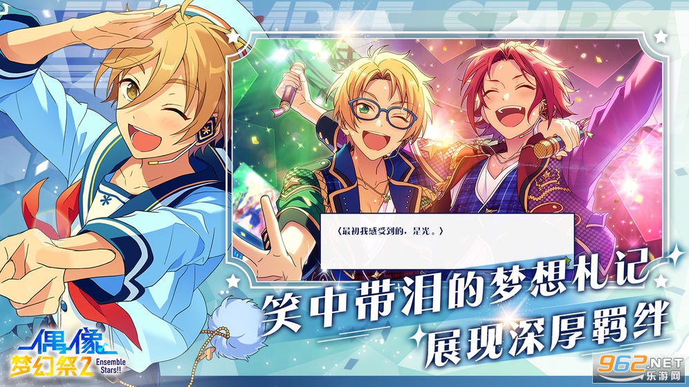 《偶像梦幻祭2》的剧情承接《偶像梦幻祭》的剧情,由知名轻小说家“日日日”主笔,偶像们正式从校园走向社会,但成长和蜕变的过程中不是一帆风顺,总是充满了各种疑惑、踌躇、欢笑和泪水,他们在合唱广场里每天都上演着不同的羁绊故事,让玩家充分融入沉浸其中,每分每秒都牵动心弦!