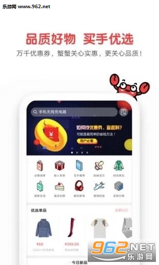 《蟹蟹优选app》这是一个超级省钱的在线购物软件,可以让你省钱。每天,我们为每个人选择数以万计的购物优惠券,并有数千种优质产品等着您带回家。购买后,你也可以回扣,购物更划算!