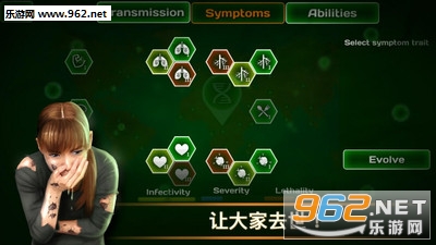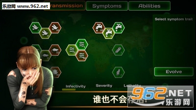 你首先选择一个地方来控制疾病的传播和进化,根据所处区域有选择的进化生物死亡病毒,增强疾病的杀毒特性:生存,传播,症状,活力,进化。观察生物疾病生存情况。
