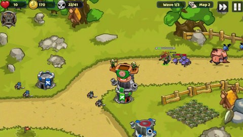 1、使用强力的英雄,指挥士兵建造防御塔,在王国之外击杀所有的攻城军队。
