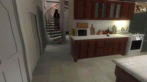 等屏幕不闪后下楼,楼梯后面的门可以打开了,打开后发现是地下室,往里走一步,屏幕又开始闪,赶紧的转身跑,跑到厨房用墙卡住它,安心等它消失。