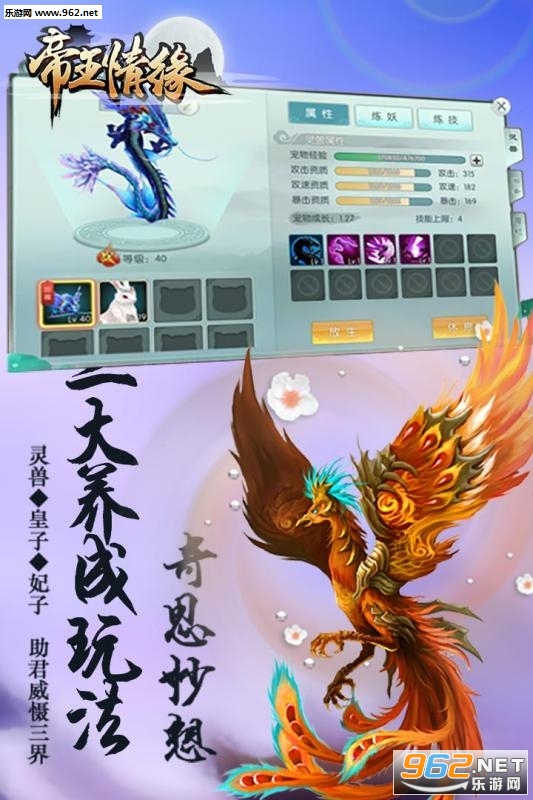 《帝王情缘》邂逅唯美三世情缘。全新的修仙世界,唯美国风画面,水墨丹青重温浪漫古风文化。进入游戏即拥有帝王身份,上朝批奏折、宠幸后宫佳丽、皇子公主培养等众多创新玩法等你体验。求取仙法、匡扶社稷,最终参悟神谕,号令天下群雄,成为九五至尊!多种社交系统功能,全新修仙世界!渡劫、御剑,战天下,诛仙、弑神,统三界!仙途中与君重温修仙情缘!