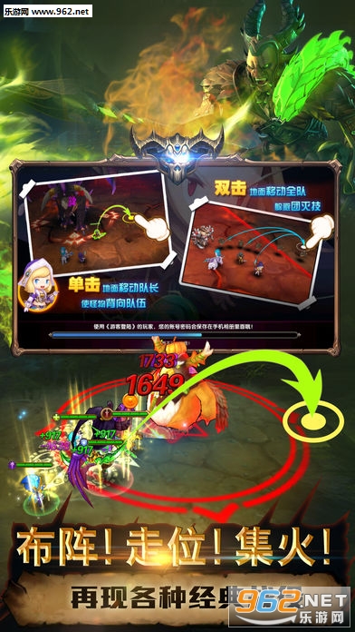 颠覆传统手游的创新之作!拥有全新的战斗系统,让你体验不一样的即时战斗游戏!布阵走位不能少,冲锋陷阱集火打怪!原滋原味再现副本战斗经典配合!