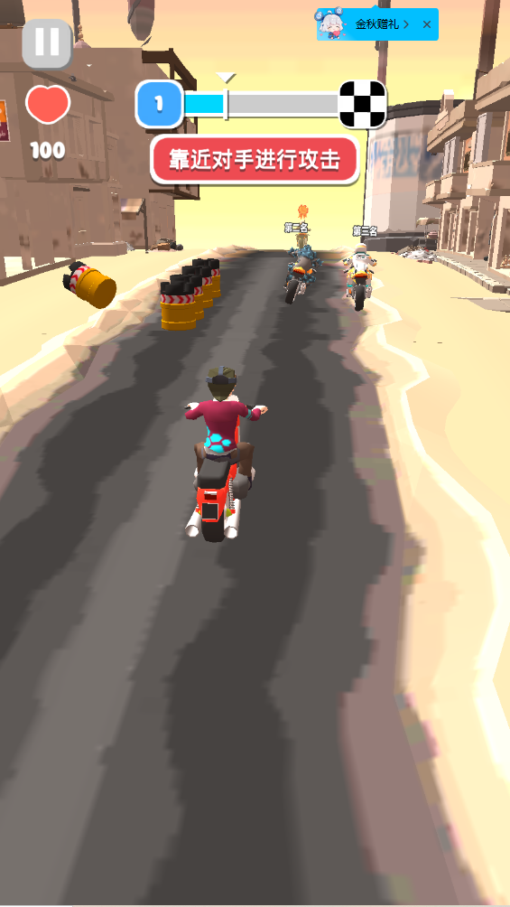 游戏是一款非常刺激好玩的摩托竞速游戏,游戏以第一人称视角进行,在游戏中你将需要骑一辆摩托车和他人进行比赛,你可以撞击他人使自己赢得比赛的胜利,中途还可以收集道具,或者利用道具使自己加速获得第一名