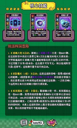 「爆破弓」构筑攻略:围绕远程C位来构建的阵容,结合了【投影魔术(3级)】、【疾风骤雨(3级)】和【玻璃大炮】这三个技能,启动后瞬间爆发能力十分强力。鉴于【玻璃大炮】与【投影魔术】双重debuff的风险,构筑的启动及衔接需要极快的速度,追求瞬间清场的效果。