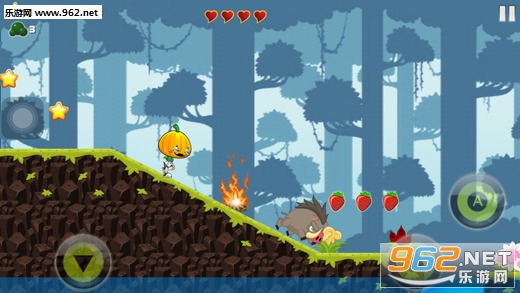 游戏中南瓜小子将遇到很多障碍,玩家需要按上键跃过障碍,玩家还要注意收集途中的星星、草莓等道具。