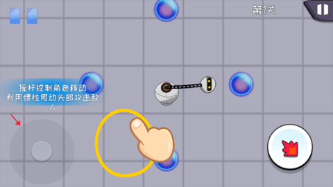 3、本游戏分为两种玩法,下面介绍第一种:是通过操纵杆控制角色的移动,并利用惯性摆动头部攻击敌人,里面的四个敌人全部使用头部攻击就可以进入下一关。