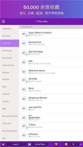 5、应用程序定期增加热门排行新歌,请不时查阅新发布的乐曲和每天一首的免费乐曲!